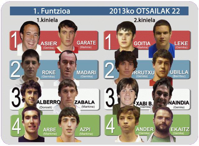 Eguneko lehenengo kinielan Bidaburu/Garate, Roke/Madarieta, Alberro/Zabala eta Arbe/Azpitarte bikoteak lehiatuko dira. Bigarren kinielan, bestalde, Goitia/Leke, Urrutxua/Ubilla, Xabier Barandika/Onaindia eta Ander/Oar Arteta bikoteek neurtuko dituzte indarrak.
