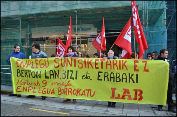Busturialdeko eta Lea Artibaiko lan merkatua “kinka larrian” dagoela eta, LAB sindikatuak protesta egin du Lanbidek Gernika-Lumon duen egoitzaren aurrean. Aitziber Barandika bertoko eskualdeetako arduradunak jakinarazi duenez, egoerak nabarmen egin du okerrera 2008tik 2012ra. Dioenez, langabezia tasa bikoiztu egin da, eta 2.258 lanpostu suntsitu dituzte bi eskualdeak kontuan hartuz gero.