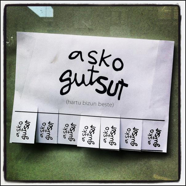 Pegatina zurietan Asko Gutsut idatzi, eta tabernetako bainugeletan hasi ziren horiek itsasten. Maiteminduen egunean ekin zioten, barriz, bigarren faseari. Asko Gutsut zioten kartelez josita esnatu zen Bermeo otsailaren 14an. Lana eskaintzen edo eskatzen duten kartelen moduan, maitasuna eskaintzen hasi zen, dohainik, oraindik anonimotasunean jarraitzen duen herriko talde bat. Paper zatitxo bategaz nahikoa ez duten horientzako be mezu argia zabaltzen dute karteletan: «Hartu behar duzun beste».