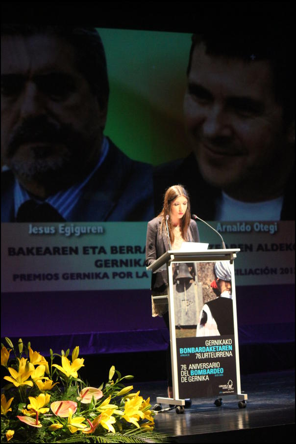 Egigurenen alabak amaitutakoan, Begoña Landa Gernika-Lumoko zinegotziak Otegik Logroñoko (Espainia) kartzelatik bidalitako gutun bat irakurri du. Otegiren berbetan, “arduraz beteriko ohore bat da Gernika-Lumoren izena daraman saria jasotzea”.