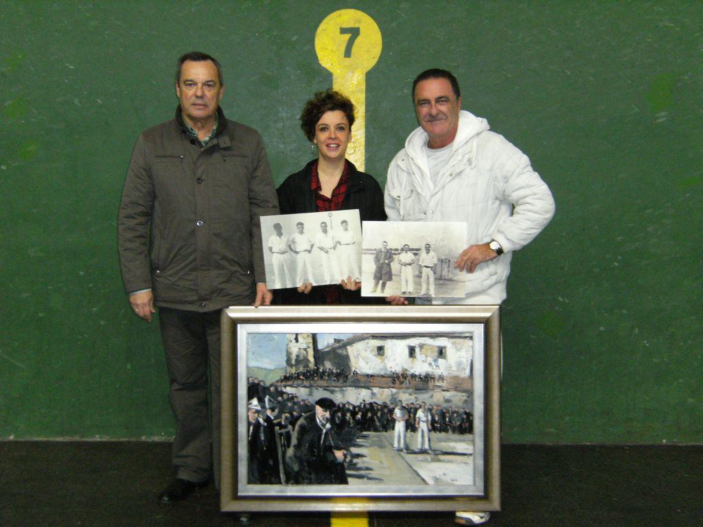 Nerea Angulo, Pedro Laspiur margolariagaz eta Juan Carlos Guerra Artza pilota elkartearen presidenteagaz