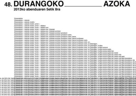 Izen laburragoagaz, baina hedapen zabalagoagaz dator aurten orain arte Durangoko Euskal Liburu eta Disko Azoka bezala ezagutu izan dena. 48. edizio honetatik aurrera, Durangoko Azoka izena hartuko du, jadanik ez dituelako soilik liburuak eta diskoak biltzen. Hori bai, aurreko urteetan legez, ehunka nobedade eta ekitaldi hartuko ditu oraingoan ere, eta horien artean izango dira Lea-Artibai, Mutriku eta Busturialdeko sortzaileen dozena batetik gora lan ere.