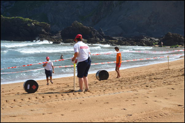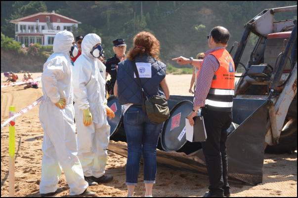Beste simulazioan herritar batek hondarretan gasoliozko bi bidoi ikusi eta Sos Deiak-era deitu du horren berri emateko. Berehala, handik abisua pasa diete hondartzetako salbamentu eta sorospen zerbitzuei. Eta baita Ertzaintzari eta suhiltzaileei ere. Horiek lekura joan eta bidoi horiek zeudela baieztatu dutenean martxan ipini dituzte segurtasun neurriak. Lekua zinta batekin inguratu dute, bainua debekatzen duen bandera gorria ipini dute, bozgorailuetatik erabiltzaileak jakinaren gainean ipini dituzte. Berehala osasun eta ingurumen sailetako guardiako teknikoak heldu dira eta sorosle eta hondartzainekin batera frogatu dute bidoiek ez zutela inolako isurketarik. Behin kutsadura arriskurik eta ingurumenerako kalterik ez zegoela ziurtatuta bidoiak kendu dituzte hondartzetako garbiketa zerbitzuko ohiko baliabideekin.