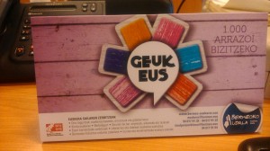Geuk Eus. 1.500 ale inguru argitaratu dituzte, eta jendaurrean lan egiten den leku publikoetan euskararen erabilera sustatzea dute helburu nagusia; izan ere, bezeroen eta establezimendu publikoetako langileen arteko harremana euskaraz izateari bidea eman gura zaio.