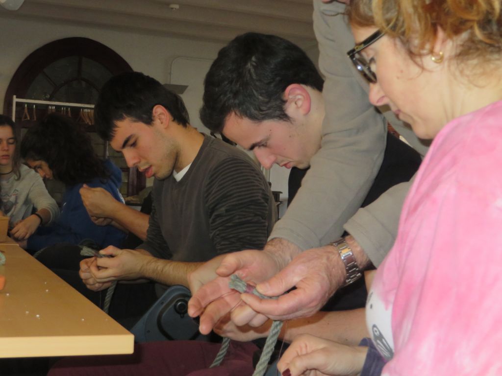 Horretarako, baina, lan handia dute aurretik. Denborarik galdu barik hasi ziren lanean lehen egunean, aurreko zapatuan. Dagoeneko ikasi dute sokaren punta nola lotu behar den, aska ez dadin. Horretarako sistema bat baino gehiago dagoela azaldu die Gangoitik ikasleei; hala ere, gehien erabiltzen dena irakatsi die. Azalpenak eman, zelan egin ikusi, eta martxan hasi dira neska-mutilak. Gangoitik “erraz- erraza” dela esaten badu ere, uste baino zailtasun handiagoa dauka sokaren punta lotzeak. Lasai egoteko eskatzen die erretiratuta dagoen arrantzaleak ikasleei; “praktika” dela gakoa. Edozein modutan, onena, itsasoan bertan aritzea dela. Hori horrela, ikastaroa amaituta, ikasitakoa praktikan jartzeko irteera egingo dute guztiek.