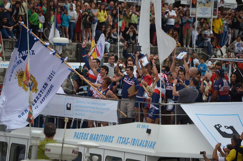 Urdaibaiko arraunlariak iaz, Kontxako bandera astintzen.
