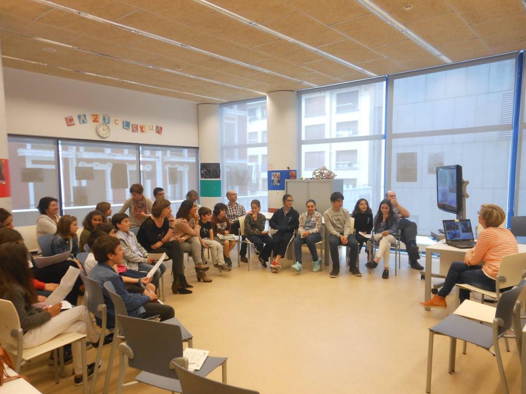 Ikasleak Bermeoko Udaleko ordezkariei aurten egindako lana azaltzen. Argazkia: Bermeoko Udala