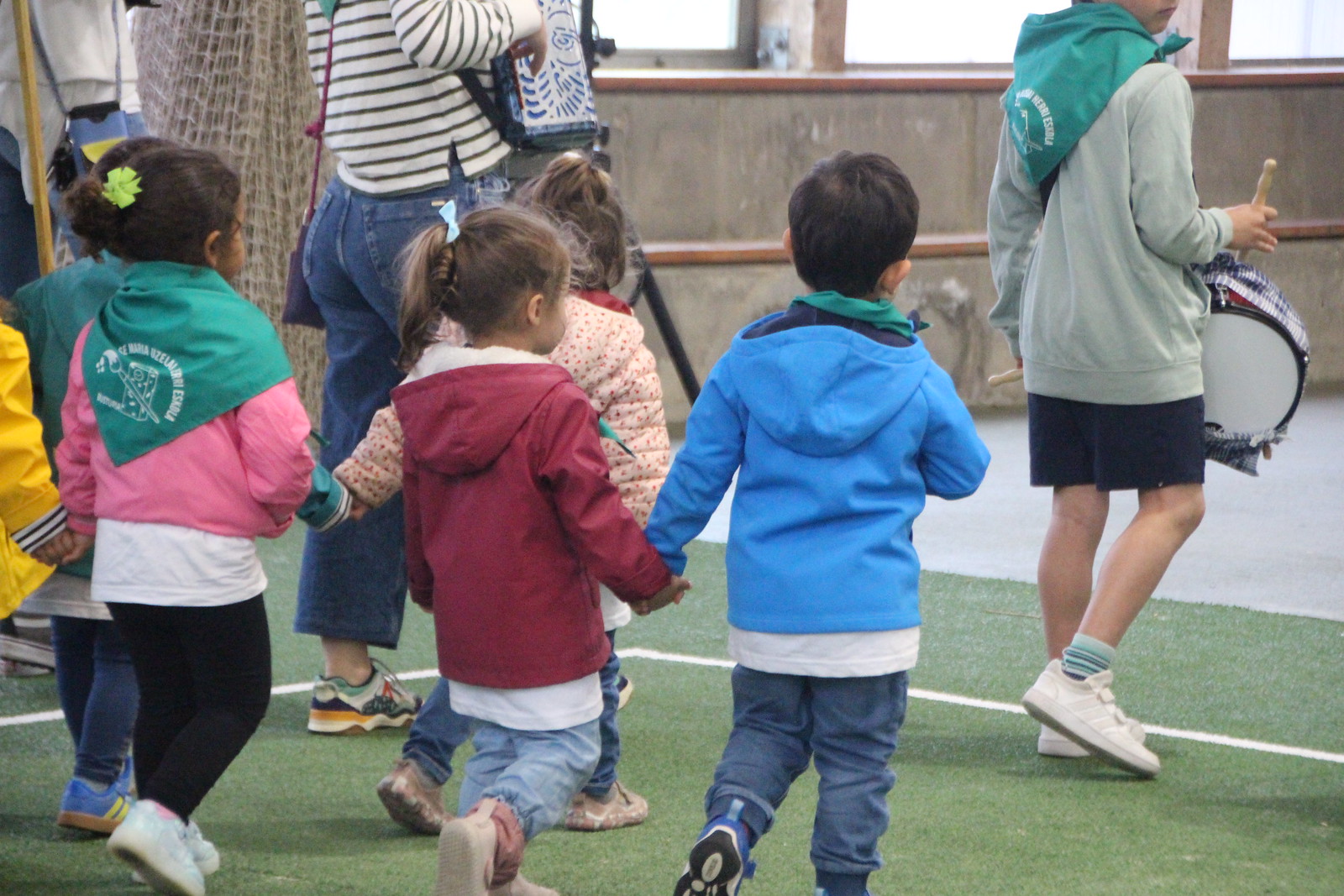 Aterpean eta euriaz babestuta zeudelarik, Urzelaiko ikasleek bertsoak abestu dituzte, eskola txikien aldeko aldarrikapenak eginez. Gainera, gainontzeko eskoleei kopla bana eskaini die, ongi etorria eman eta goiza jai giro alaien pasatzeko dei eginez. Bertsoei trikitixa eta pandero hotsek lagundutako kalejirak eman dio jarraipena. Zikloka banatuta, eskoletako ikasle, irakasle eta ordezkariek dantza eta kanturako tartea hartu dute.
