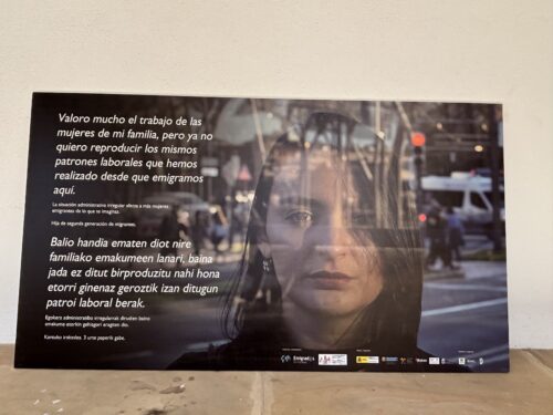 Klaustroan zehar banatutako panel ezberdinetan elkartea osatzen duten emakume ezberdinen egoera eta gogoetak aurkezten dituzte, besteak beste Katherin Ocampo Salazarrena. Duela 16 urte bere jaioterria atzean utzi behar izan zuen Ocampok, bere “etorkizuna idatzita” zuenaren sentsazioagaz: bere amak, izebak eta amonak egin legez, zaintza eta garbiketa lanak izango zituen ogibide.