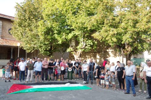 Ajangizko udaletxe aurrean Palestinaren aldeko eltze hotsa zabaltzeko bildu ziren herritarrak.Ajangizko Udala