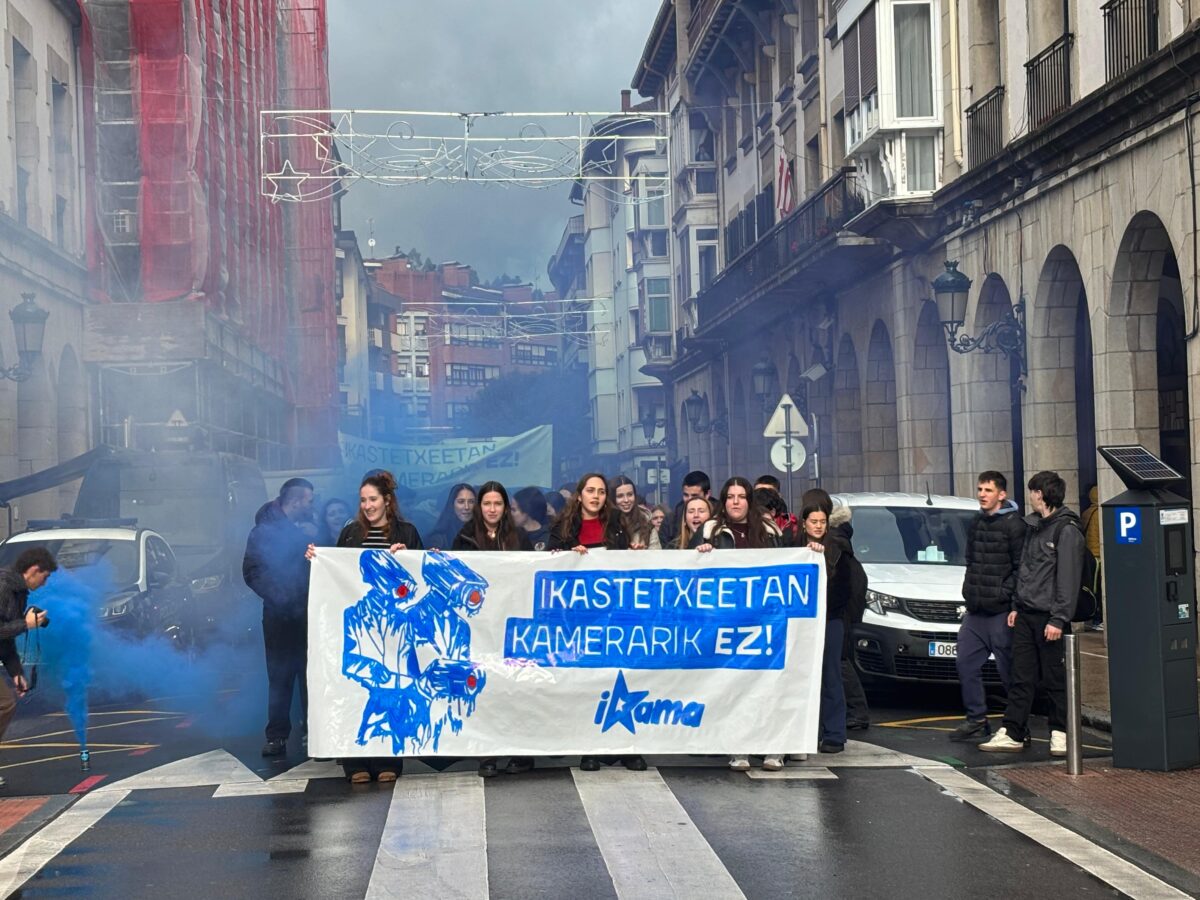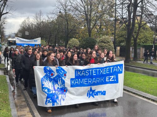 Eusko Jaurlaritzak hezkuntza zentroetan kamerak jartzeko hartu duen erabakiaren aurka daudela erakutsi dute ikasleek, Ikamak deituriko manifestazioan. 11:00tan hasi dira herriko kaleak aldarrikapenez betetzen, eta hortik aurrera greba deitu dute.