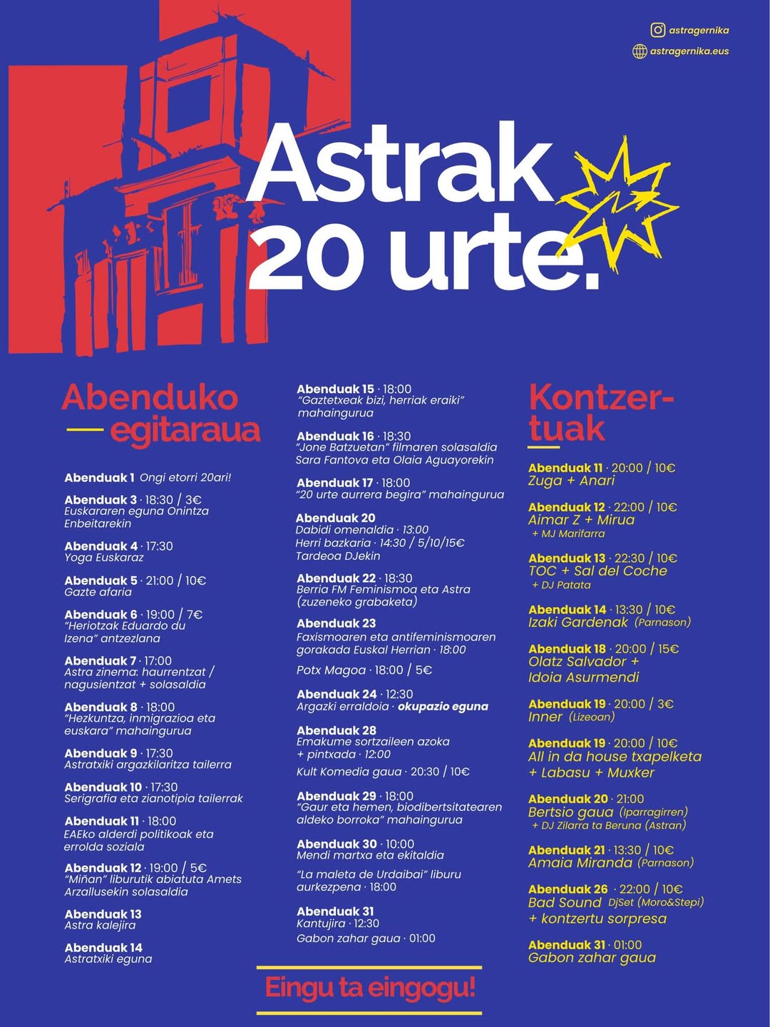 Hala, 20 urtetan herri eta eskualdeak egindako lana goraipatzeko unea ailegatu dela uste dute, eta herritarrei bertaratzeko deia egin diete. Izan ere, Astra Gernikentzako zela aldarrikatu zuten sasoi hartan, eta, Gernike Astra da, Astra Gernike da adieraziko dute orain. Ospakizun bat dute aurretik, baina hasierako ilusio eta gogo beragaz jarraitzen dute, ze, Eingu eta eingogu.