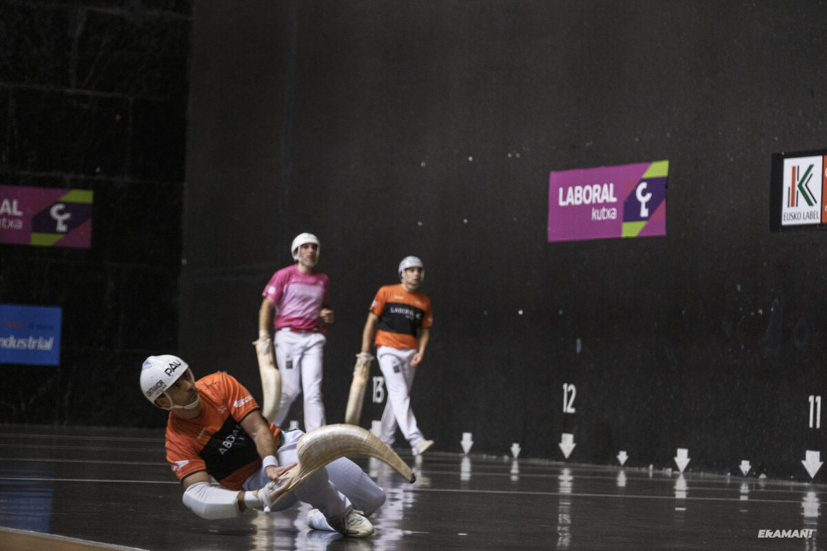 Argazkia: Eraman Jai Alai. Aurtengo Eusko Label Winter Seriesak egun arte emandako neurketarik ikusgarrienetakoa bizi izan zuen atzo [abenduak 1] Jai Alaik. Azken urte bietako txapeldunek, Aritz Erkiaga ispastertarrak eta Ion Ibarluzea markina-xemeindarrak, ez dute aurtengo ekitaldia iraganeko irmotasunez ekin, eta atzokoan ere sufritzea egokitu zitzaien. Johan Sorozabal ordezkatu zuen Jean Dominique Olharan pauetarra eta Gorka Sorozabal miarriztarra hautagaiei gauzak gaitz ipintzeko erabateko intentzioz kantxaratu ziren, eta halaxe egin zuten. 539 pilotakada on jaurti zituzten lehiak iraundako 86 minutuetan, eta bikote lapurtarrak, hirugarren setean zirt edo zart eginda, garaipen erraldoia lortu zuen. Faboritoek, sailkapenari eusteko, den-dena bikain egin beharko dute aurrerantzean, eta gainontzeko partiduen emaitzen esperoan egon.