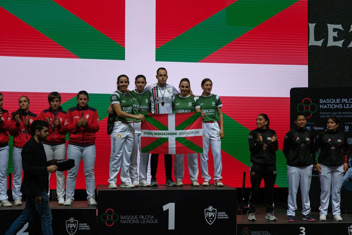 Olatz Arrizabalagak, Euskal Selekzioaren koloreak defendatuz, urrezko domina irabazi du Pilota Nazioen Ligan, emakumezkoen binakako esku pilota kategorian.
