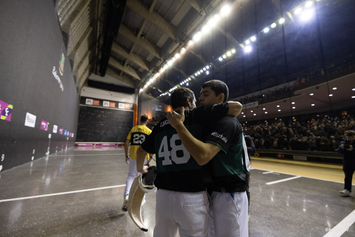 Argazkia: Eraman Jai Alai. Alex Goitia markina-xemeindarrak eta Unai Lekerika gernika-lumotarrak Eusko Label Winter Series txapelketa poltsikoratzeko balentriak egiten jarraitzen dute. Jai Alaiko errezeta pil-pilean dago, finalaurrekoen ligaxkan bete-betean sartuta, eta bikote horrek azkenburukoraino iristea du jomuga. Atzo [urtarrilak 5], zesta-puntaren katedralaren harmailak beste behin lepo bete zituzten ikusleen aurrean, hiru barik, bi izan ziren magia egin zuten erregeak.