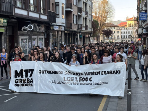 1.500 euroko gutxieneko soldata propioaren ezarpena eta soldaten hobetzea izan dituzte aldarri nagusia gaur [martxoak 17], LAB, ELA, Steilas, Etxalde eta Hiru sindikatuek deitutako greba orokorragaz bat egin dute Hego Euskal Herriko herritarrek. Sistema “kapitalista, heteropatriarkal, ekozida eta arrazistak” mundua hankaz gora jarrita daukala eta “Euskal Herria errealitate horretatik salbu ez dagoela” salatu dute berdin hiriburu zein herrietan, tartean Busturialdekoetan: “Aberatsak aberatsago dira, boterea geroz eta esku gutxiagotan dago eta langile sektorea geroz eta gehiago bazterrean”.