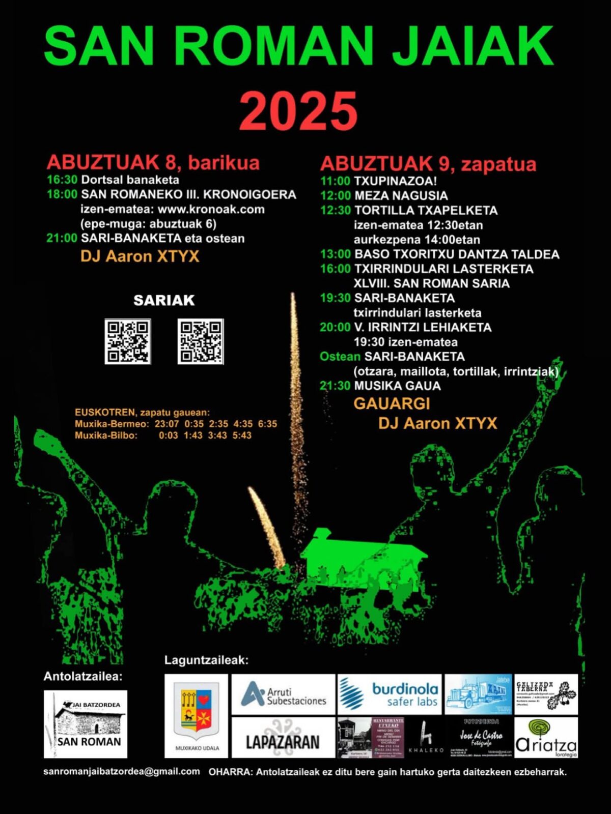 Muxika. San Romaneko Jai Batzordeak antolatuta, San Roman jaiak ospatuko dituzte abuztuaren 8an [barikua] eta abuztuaren 9an [zapatua] Muxikako San Roman auzoan.