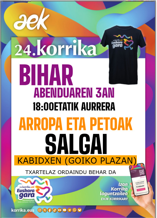 Bermeo. 24. Korrika denda Bermeora ailegatuko da abenduaren 3ean (eguaztena). Euskararen egunean datorren urteko Korrika berotzen hasteko asmoz, petoak eta arropak erosteko aukera egongo da Kabidxen, 18:00etatik aurrera., Txartelarekin ordaindu beharko da.