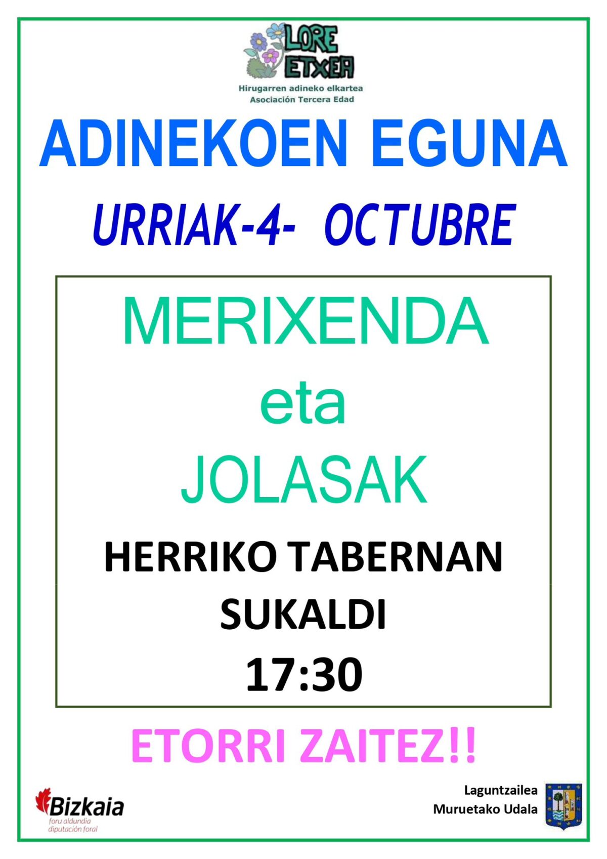 Murueta. Merienda eta jolasekin ospatuko dute adinekoen eguna Muruetan, urriaren 4ean [zapatua]. Sukaldi Herrik Tabernan jarri dute hitzordua, 17:30ean.