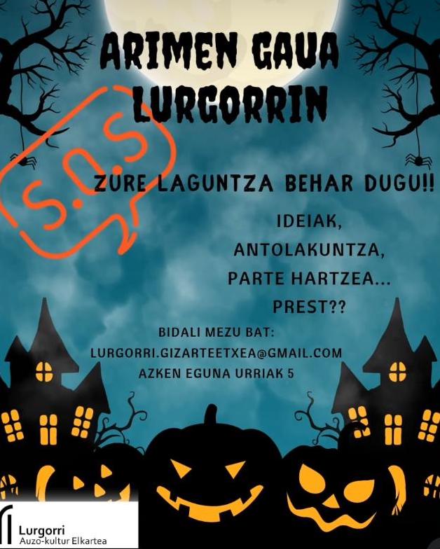 Gernika-Lumo. Arimen gaua prestatzen dabiltza Lurgorri Auzo Kultur Elkartekoak, eta herritarren laguntza eskatu dute hori prestatzeko: ideiak, antolakuntza, parte hartzea… Hala, proposamenak batzen dabiltza, eta horretarako azken eguna da urriaren 5a (domeka). Ekarpenak lurgorri.gizarteetxea@gmail.com helbide elektrikora bidali beharko dira.