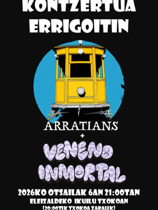 Errigoiti. Errigoitiko Kultur Klubak Arratians eta Veneno Inmortal taldeen kontzertuak antolatu ditu otsailaren 6rako, Ikuilu txokoan. Kontzertuak 21:00etan hasiko diren arren, 20:00etan zabalduko dute txokoa, esan dutenez. Sarrera borondatea izango dela ere adierazi dute.