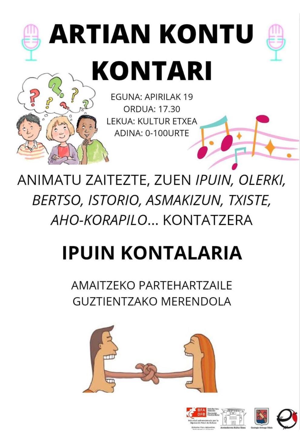 Gautegiz Arteaga. Artian kontu kontari aritzeko elkartuko dira arteagarrak apirilaren 19an (barikua), 17:30ean, kultur etxean. Ipuin, olerki, bertso, istorio, asmakizun, txiste, aho korapiloak… kontatuko dituzte bertan. Ostean, ipuin kontalaria ere egongo da.