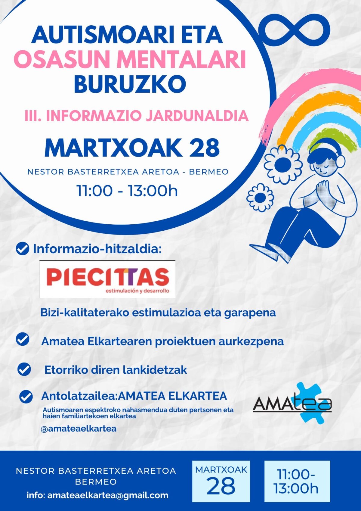 Bermeo. Amatea Elkarteak antolatuta, Autismoari eta osasun mentalari buruzko III. Informazio jardunaldia egingo dute martxoaren 28an [zapatua], 11:00etatik 13:00etara, Nestor Basterretxea Aretoan. Jardunaldian zehar Amatearen proiektuen eta etorriko diren lankidetzen aurkezpena egiteaz gain, Piecittasen eskutik informazio-hitzaldia egongo da.