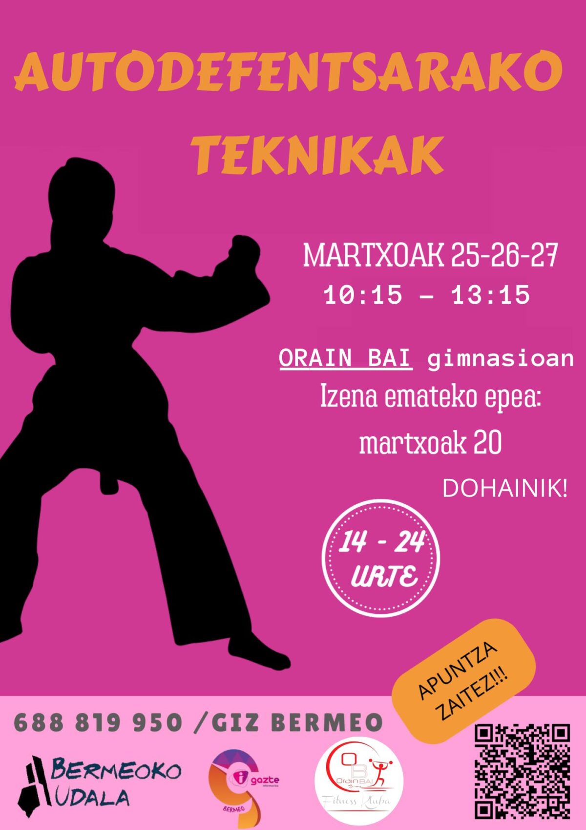Bermeo. Bermeoko Udalak, Bermeoko GIZek eta Orain Bai fitness klubak antolatuta, autodefentsarako teknikak ezagutzeko ikastaroa, martxoaren 25ean, 26an eta 27an, Orain Bai gimnasioan, 10:15etik 13:15era. 14 eta 24 urte bitartekoei zuzenduta dago.