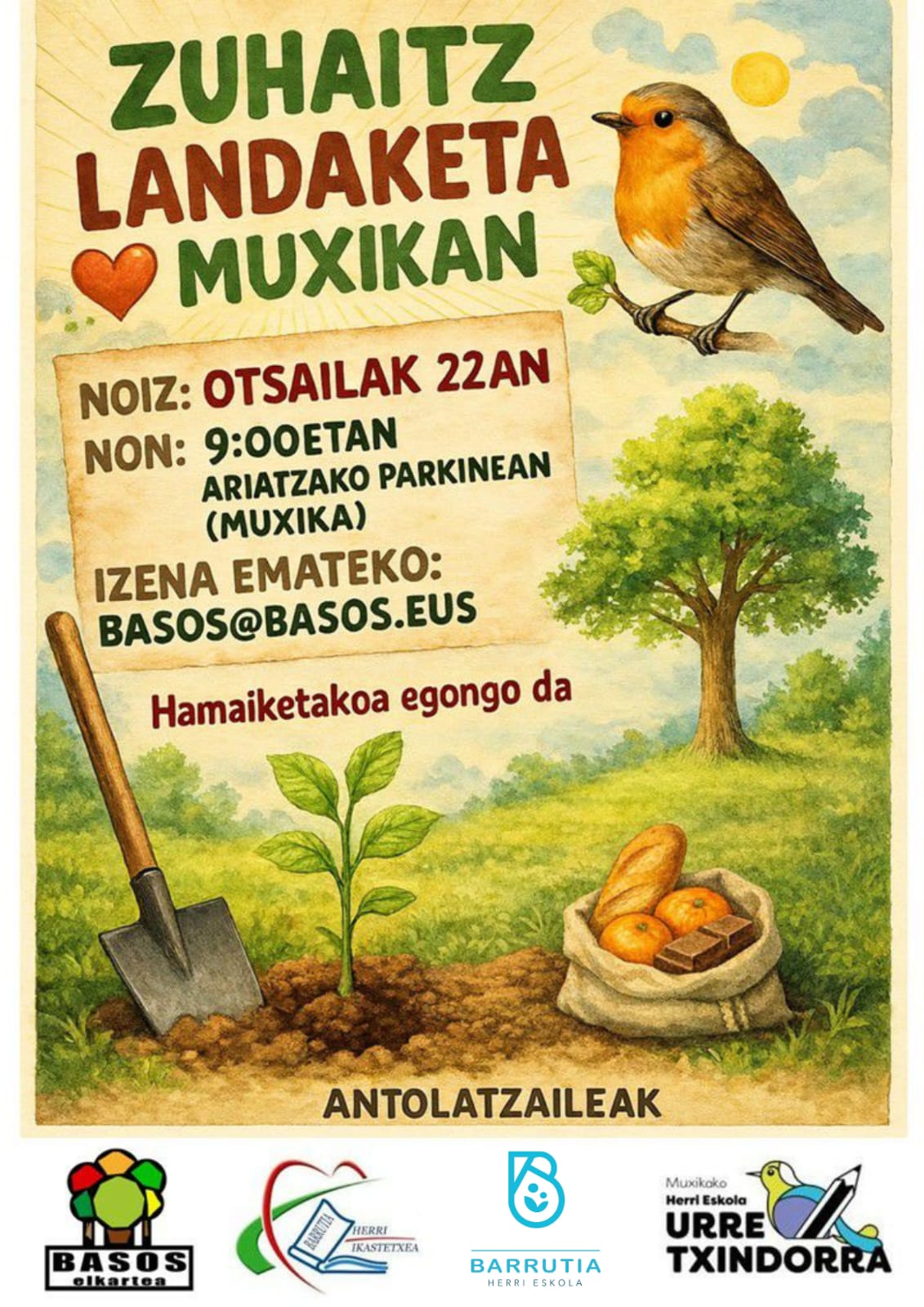 Muxika. BaSOS elkartekoak bertoko basoa handitzen ari dira Ordorikako lurretan, eta landaketa bat prestatu dute otsailaren 22rako (domeka) Barrutiko eskolako, Barrutialde institutuko eta Muxikako Urretxindorra eskolako lagunekin; 09:00etan jarri dute hitzordua Ariatzako aparkalekuan.