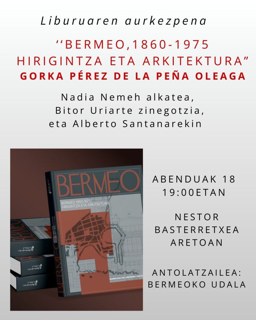 Bermeo. Gorka Perez de la Peña Oleagaren Bermeo, 1860-1875 hirigintza eta arkitektura liburuaren aurkezpena hartuko du Nestor Basterretxea aretoak eguenan, 19:00etatik aurrera. Nadia Nemeh alkatea, Bitor Uriarte zinegotzia eta Alberto Santana izango dira horretan.