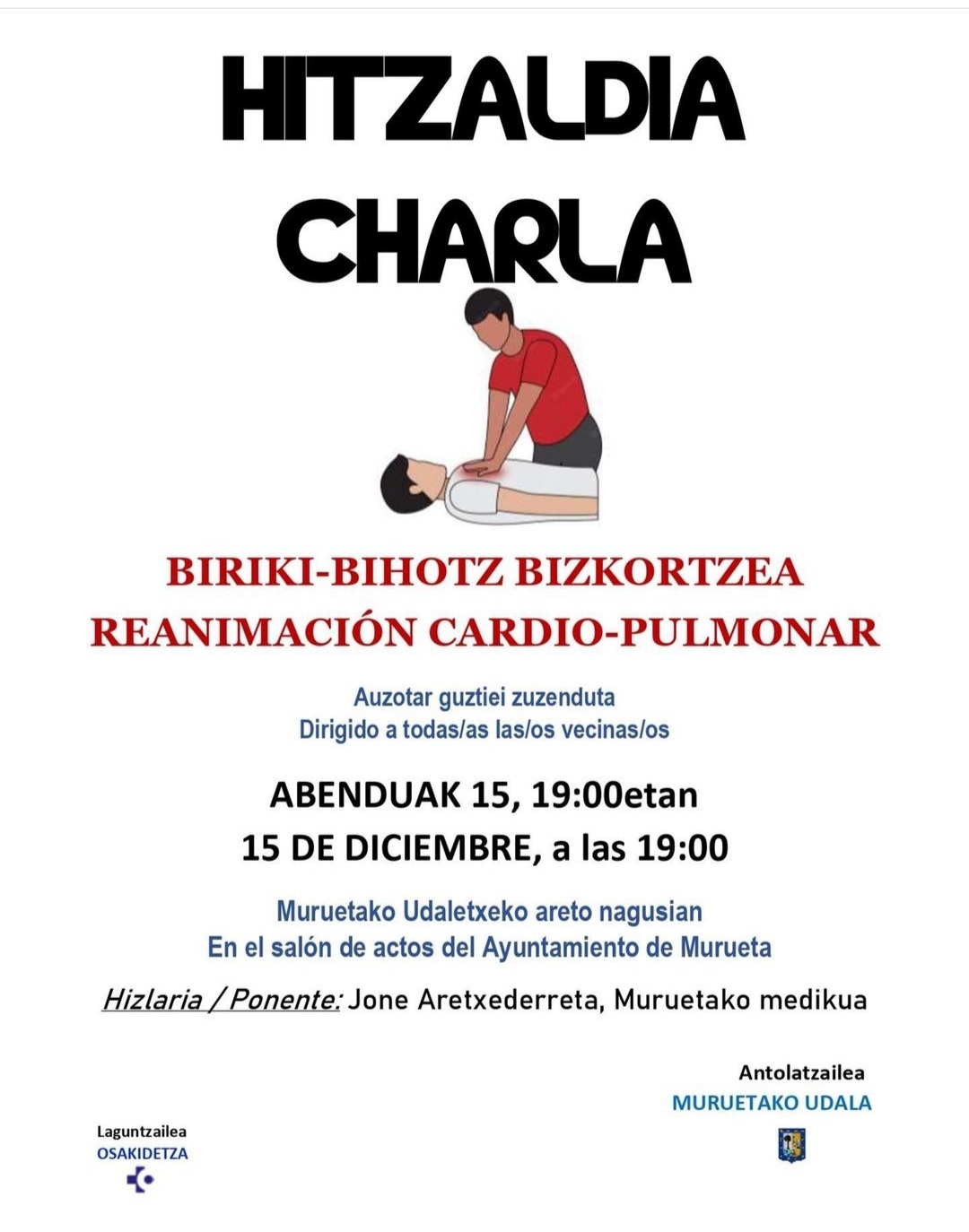 Murueta. Jone Aretxederreta Muruetako medikuaren eskutik, biriki eta bihotz bizkortzeei buruzko hitzaldia, abenduaren 15ean (eguena), 19:00etan, udaletxeko areto nagusian.