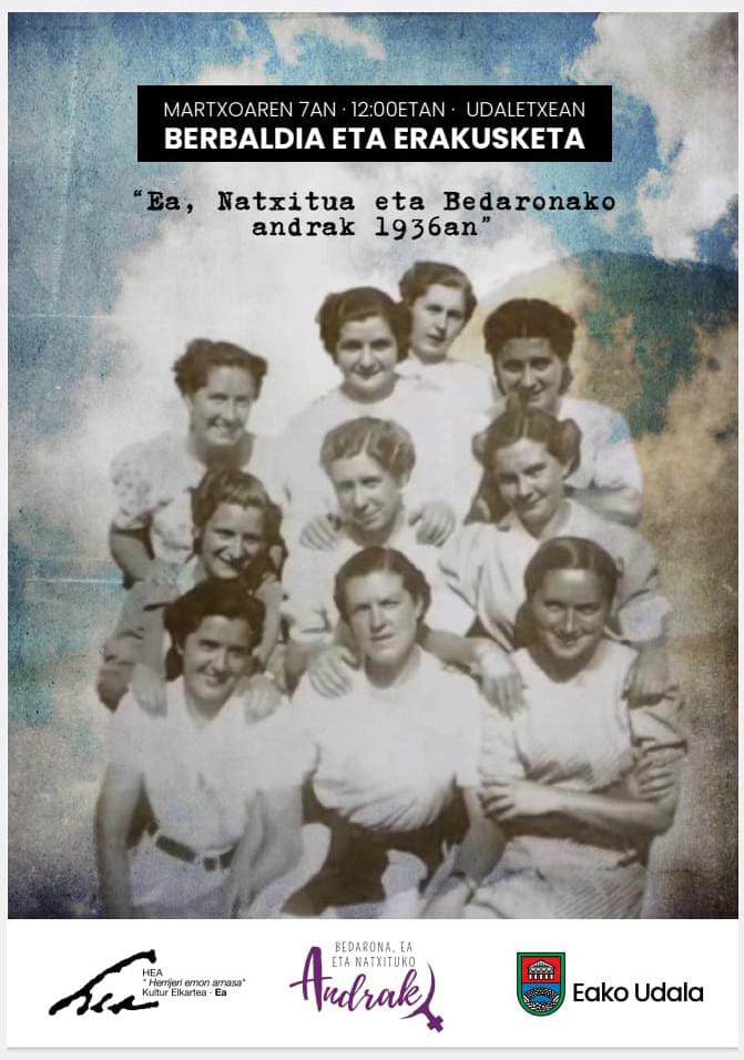Ea. Zapatuan [martxoak 7] Udaletxean hitzordu garrantzitsua izango dute eatarrek. Izan ere, Ea, Natxitua eta Bedaronako andrak 1936an erakusketa eta berbaldia antolatu du Udalak martxoak 8aren baitan, Herrijeri emon arnasa kultur elkarteagaz eta Bedarona, Ea eta Natxituko Andran laguntzagaz.