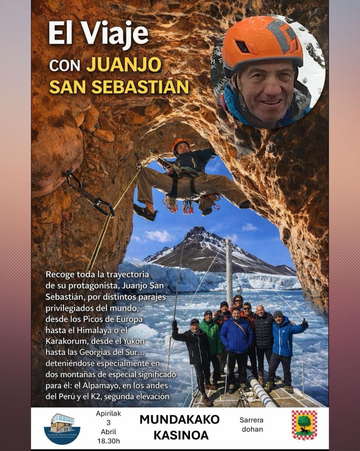 Mundaka. Kasinoak ‘El viaje con Juanjo San Sebastián’ izeneko berbaldia hartuko du, hilaren 3an. Mendizalearen bilakaera guztia errepasatuko dute, bereziki, K2 eta Alpamayo mendietan fokua ipinita.