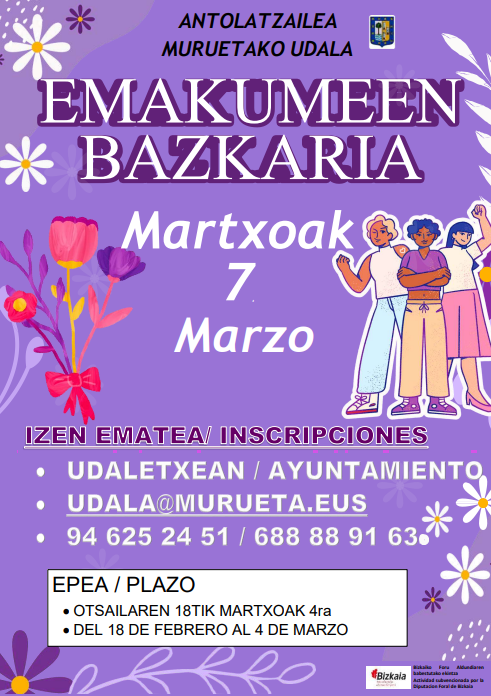 Murueta. Muruetako Udalak, Emakumeen Nazioarteko Eguna baliatuta, emakumeen bazkaria antolatu dute martxoaren 7an [zapatua]. Aurretik izena eman beharko da, udaletxera bertaratuz, udala@murueta.eus helbide elektronikora idatziz edo 94-625 24 51 edo 688 88 91 63 telefono zenbakietara deituz. Martxoaren 4a [eguaztena] da izen emateko azken eguna.