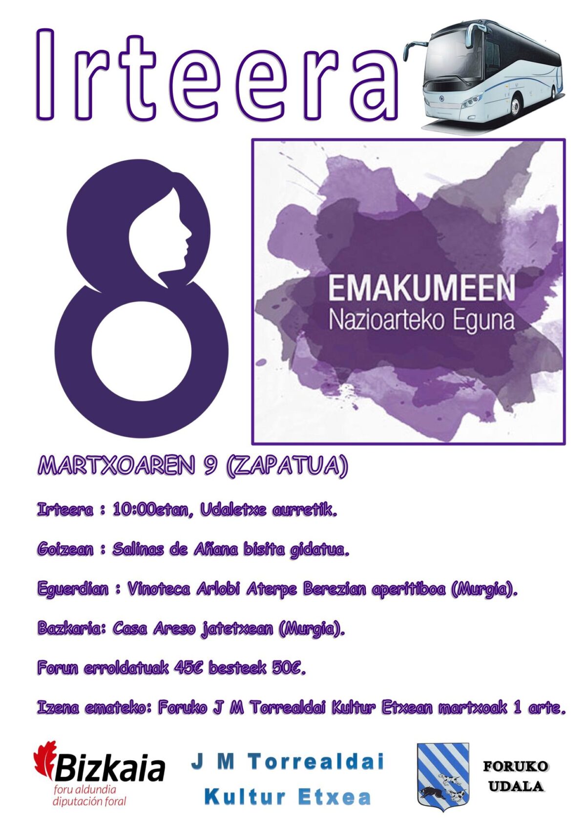 Forua. Emakumeen Nazioarteko Eguna dela eta, irteera antolatu du Foruko Udalak martxoaren 9an [zapatua], udaletxetik hasita. Goizean Salinas de Añanatik bisita gidatua egingo dute, eta eguerdian Vinoteca Arlobi Aterpe Berezian aperitifa jango dute. Ostean, bazkaria Casa Areso jatetxean (Murgian).