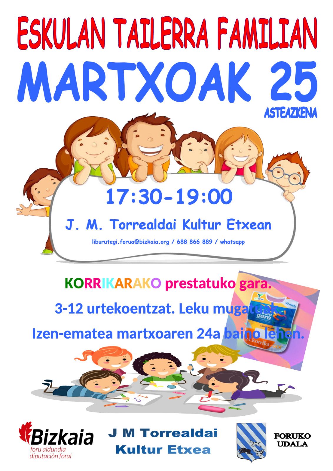 Forua. 3 eta 12 urte bitartekoentzako eskulan tailerra egingo dute martxoaren 25ean [eguaztena], 17:30etik 19:00etara, J.M. Torrealdai Kultur Etxean. Zehaztu dutenez, Korrikarako prestatuko dira. Aurretik izena eman beharko da, horretarako azken eguna martxoaren 24a [martitzena] izanik: liburutegi.forua@bizkaia.org helbide elektrinikora idatzi edo 688 86 68 89 telefono zenbakira deitu edo idatzi behar da (WhatsApp).