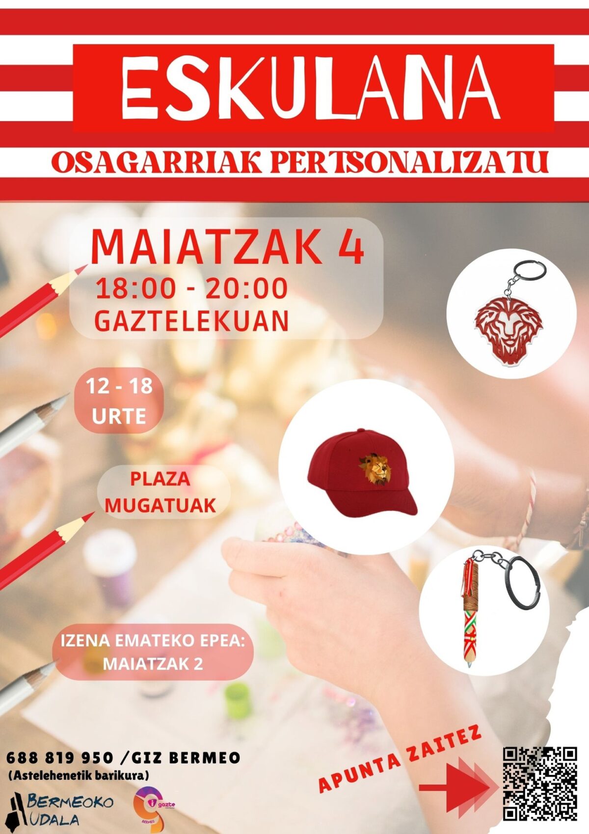 Bermeo. Osagarriak pertsonalizatzen ikasteko eskulanen tailerra egongo da, maiatzaren 4ean [zapatua], 18:00etatik 20:00etara, Gaztelekuan. Tailerra 12 eta 18 urte bitartekoei zuzenduta daude. Sarrera doakoa izango da, baina aurretik izena ematea beharrezkoa izango da. Izena emateko azken eguna maiatzaren 2a da [eguena], eta karteleko QR kodearen bidez egin ahalko da.