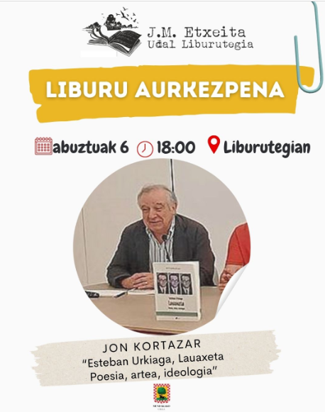 Mundaka. Mundakako Udalak antolatuta, Jon Kortazarrek Esteban Urkiaga, Lauaxeta: poesia, artea, ideologia liburua aurkeztuko du abuztuaren 6an [eguaztena], 18:00etan, J.M. Etxeita Udal Liburutegian.