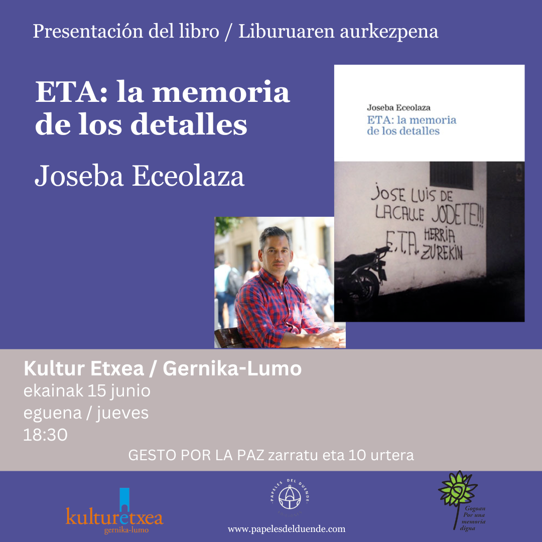 Gernika-Lumo. GOGOAN por una memoria dignak antolatuta, Joseba Eceolazak ETA: la memoria de los detalles liburua aurkeztuko du ekainaren 15ean (eguena), 18:30etik aurrera, Gernika-Lumoko kultur etxean.