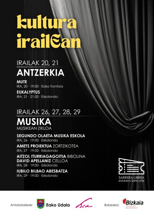 Argazkia: Jon Ander Urresti. Ea. HEA Kultur Elkarteak eta Eako Udalak antolatuta, Jon Ander Urrestik Eukalyptus antzezlana eskainiko du irailaren 21ean, 21:00etan hasita, Eskolondon.