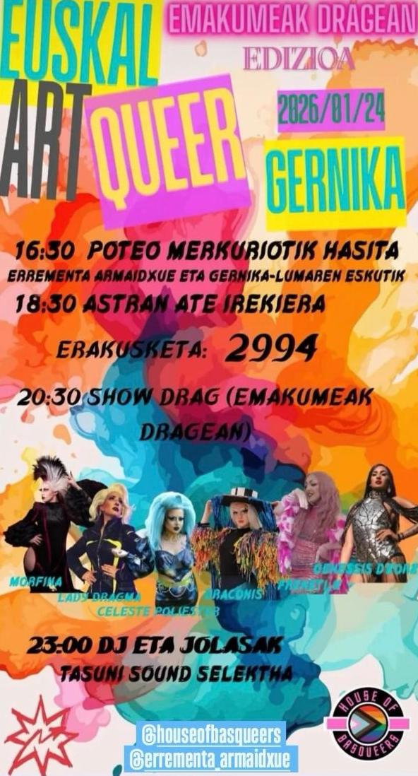 Gernika-Lumo. Euskal Art Queer jaialdiak Gernika-Lumo hartuko du urtarrilaren 24an (zapatua), 16:30etik aurrera. Izan ere, drag show bat eskainiko dute Astran, emakumeak dragean duten presentzia erakustea helburu. Baina, aurretik, 2994 erakusketa egongo da ikusgai, eta Errementa Armaidxue eta Gernika-Lumak antolatuta, poteoa ere egingo dute giroa berotzeko.