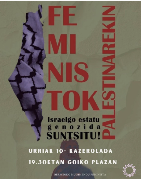 Bermeo. Bermeoko Mugimendu Feministak deituta, Feministok Palestinarekin kazerolada egingo dute urriaren 10ean [barikua], 19:30ean, Goiko Plazan.