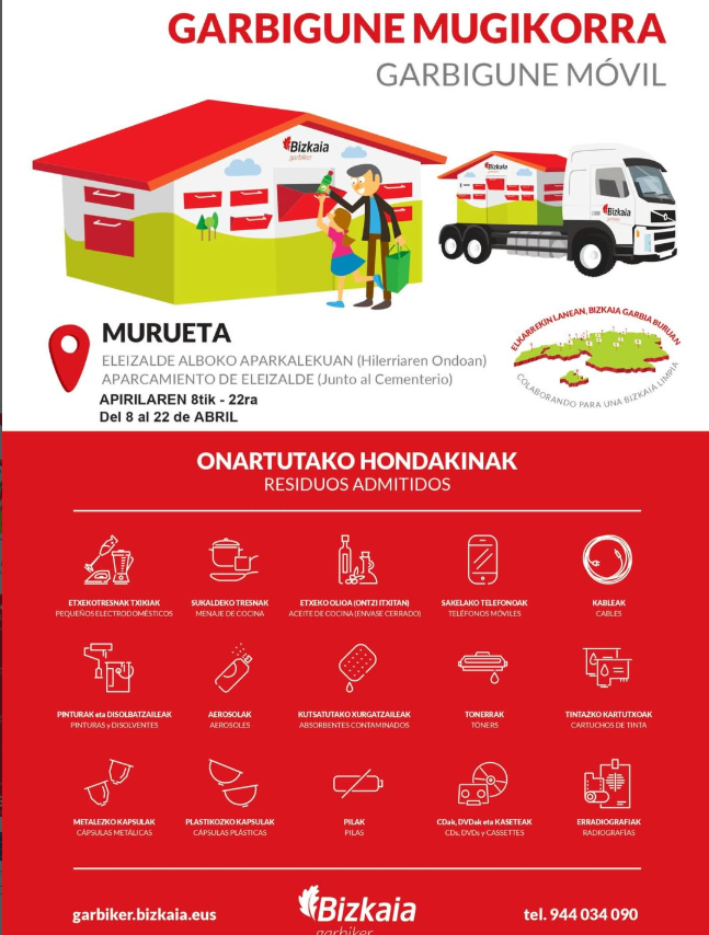 Murueta. Garbigune Mugikorra Muruetanegongo da apirilaren 8tik [eguaztena] 22ra [eguaztena] bitartean. Birziklapena herritarrentzat “errazagoa eta hurbilagoa” egitea du helburu Garbigune Mugikorrak: ohiko garbiguneetara joan beharrean, biztanleek herrian bertan ere birziklatzeko aukera izatea.Eleizalde alboko aparkalekuan kokatu dute, hilerriaren ondoan.