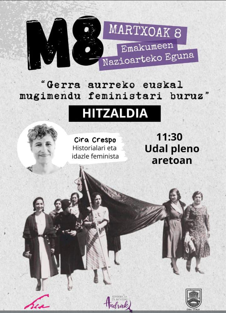 Ea. Martxoaren 8ko egitarauaren barruan, Eako Udalak, Herrijeri emon arnasa kultur taldeak eta Bedarona, Ea eta Natxituko Andrak hitzaldia antolatu dute, elkarlanean. Horretan, gerra aurreko euskal mugimendu feminista izango dute hizpide, eta Cira Crespo historialari eta idazle feministak gidatuko du hitzaldia. 11:30ean jarri dute hitzordua, Eako Udal pleno aretoan.