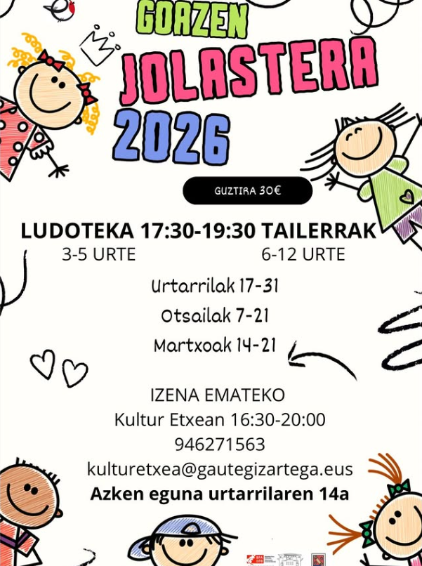 Gautegiz Arteaga. Goazen jolastera 2026 ekimenaren baitan, larunbat guztietan ludoteka eta tailerrak eskainiko dituzte 17:30eatik 19:30era kultur etxean. Jakinarazi dutenez, izena emoteko azken eguna urtarrilaren 14a da; kultur etxean eman daiteke izena, bertara hurbilduz, zein telefonoz edota posta elektronikoz.