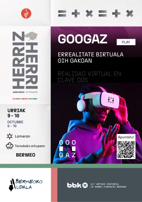 Bermeo. BBK-k eta Googaz millenial kolektiboak, Bermeoko Udalarekin lankidetzan, errealitate birtualeko bideojoko baten bidezko murgiltze-esperientzia eskainiko dute urriaren 9 [eguena] eta 10ean [barikua], Lameran, 18:00etatik 20:00era bitartean. Eguraldi txarra eginez gero Taraskako arkupera lekualdatuko da. Saio bakoitzaren iraupena 40 minutukoa izango da, eta interesdunek aurretik izena eman beharko dute, Googazen weborrialdean.