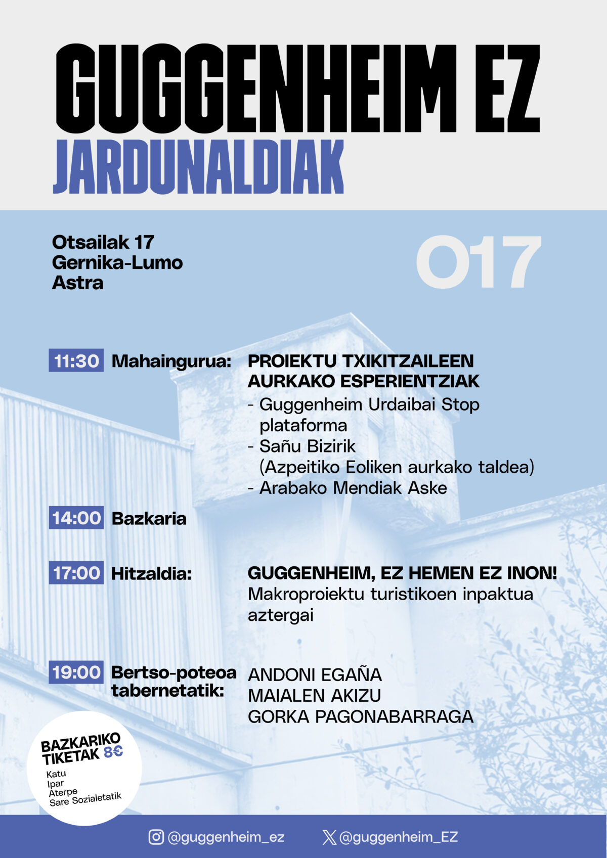 11:30. Mahaingurua. Proiektu txikitzaileen aurkako esperientziak. Guggenheim Urdaibai Stop plataformakoek, Sañu Bizirik Azpeitiko Eolikoen aurkako taldekoek eta Arabako Mendiak Aske taldekoek parte hartuko dute.