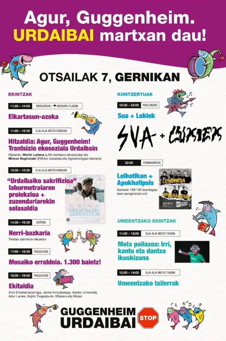 11:00-12:30. Agur, Guggenheim! Trantsizio ekosoziala Urdaibain hitzaldia, Elai Alai aretoan. Hizkariak: Martin Lallana (LAB trantsizio ekosoziala) eta Mirene Begiristain (EHUko irakaslea eta Agroekologian ikerlaria).