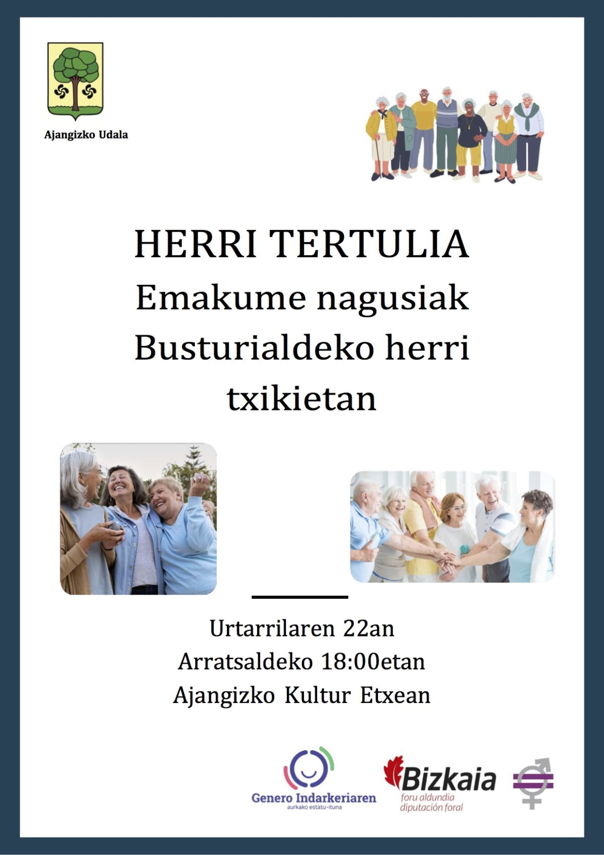 Ajangiz. Herri tertulia: Emakume nagusiak Busturialdeko herri txikietan. Urtarrilaren 22an (astelehena), 18:00etan, kultur etxean.