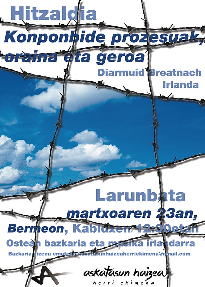 Hitzaldia: Konponbide prozesuak, oraina eta geroa. Hizlaria: Diarmuid Breatnach irlandarra. Bihar, 12:30ean, Kabidxen. Ostean, bazkaria eta musika irlandarra